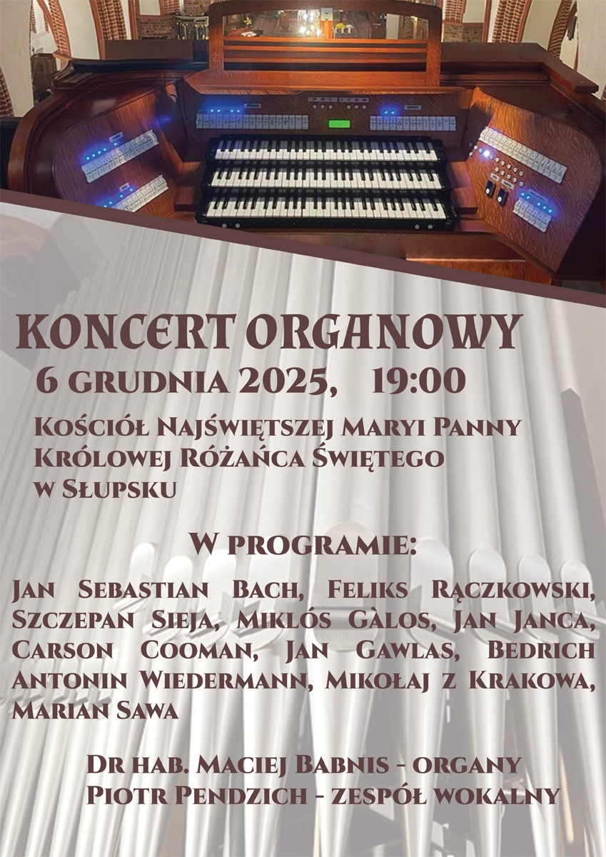 Parafia Rzymskokatolicka p.w. NMP Królowej Różańca Świętego w Słupsku zaprasza na koncert adwentowy. W programie pieśni adwentowe oraz ich organowe opracowania, których autorami są kompozytorzy z Polski, Niemiec, Czech, Węgier i Ameryki. Pieśni zaśpiewa Zespół Wokalny pod kierunkiem Piotra Pendzicha, a przy największych organach zasiądzie Maciej Babnis.