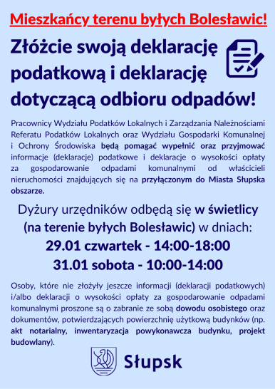 Przypominamy o możliwości złożenia deklaracji podatkowej oraz deklaracji dotyczącej odbioru odpadów komunalnych podczas specjalnych dyżurów urzędników, organizowanych z myślą o właścicielach nieruchomości położonych na obszarze przyłączonym do Miasta Słupska.