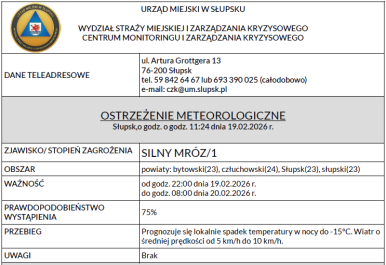 Instytut Meteorologii i Gospodarki Wodnej wydał ostrzeżenie meteorologiczne o możliwości wystąpienia silnego mrozu na obszarze miasta Słupska oraz powiatów: słupskiego, bytowskiego i człuchowskiego.