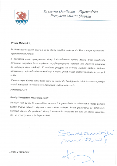 W tym ważnym dla Was czasie życzę wiary we własne siły i umiejętności. Miejcie zawsze w pamięci swoich nauczycieli i wychowawców, którym tak wiele zawdzięczacie.