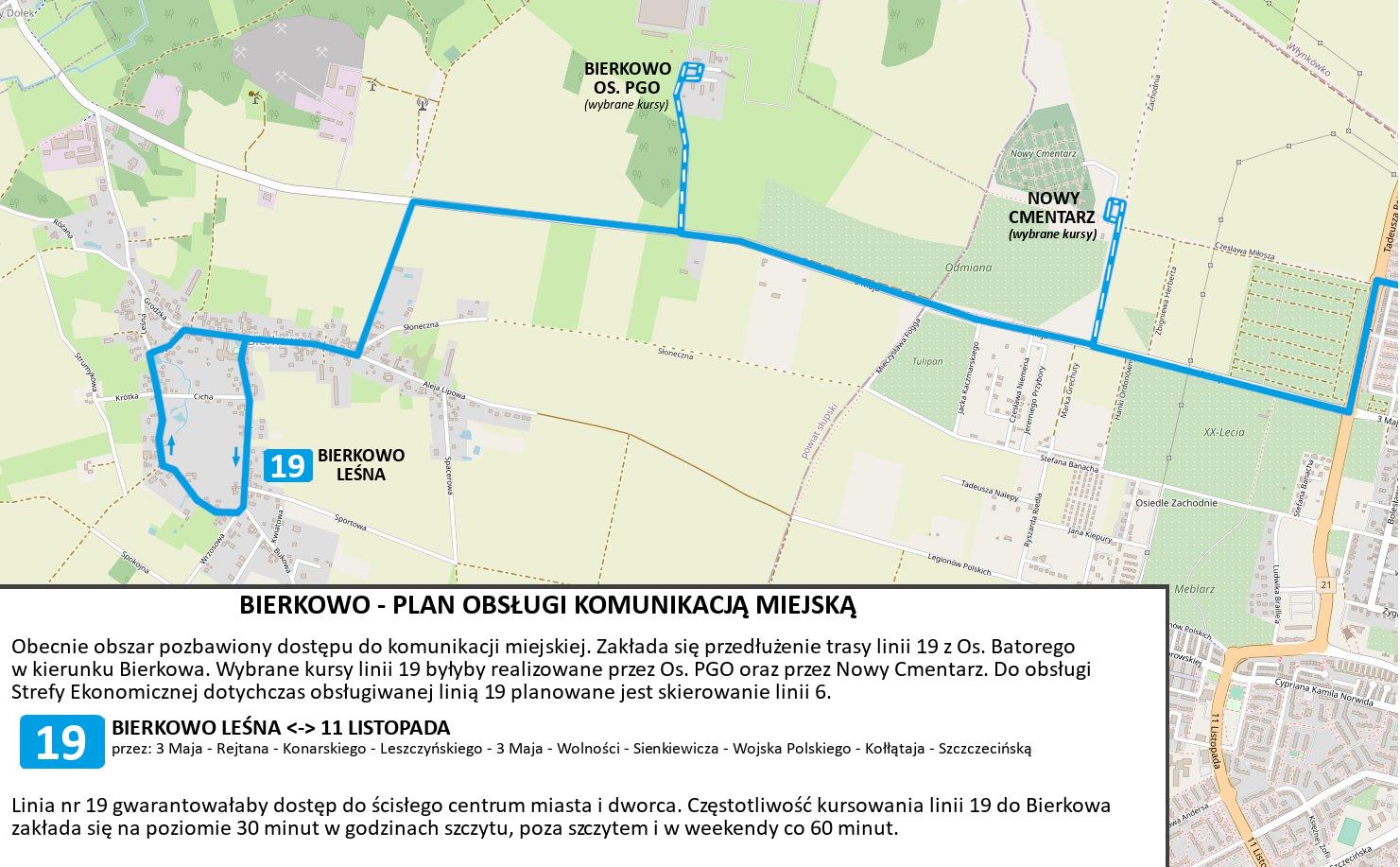 Jak widzimy na mapie obszar Bierkowa zyskałby dostępność komunikacyjną do różnych rejonów Słupska, czego teraz brakuje. Mieszkańcy, którzy nie posiadają lub nie chcą poruszać się samochodami mieliby łatwy i komfortowy dostęp np. do centrum i to z atrakcyjną częstotliwością.