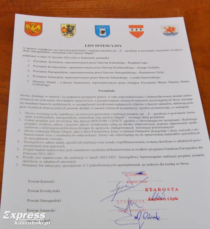 Pan Marek Goliński Wiceprezydent Miasta Słupska podpisał list intencyjny, dzięki któremu będziemy współpracowali z innymi powiatami na rzecz przygotowania i realizacji projektu dot. e-geodezji. Wspólnie będziemy zabiegać o dofinansowanie, a celem działania jest umożliwienie dostępu do spójnych i zintegrowanych informacji przestrzennych.
