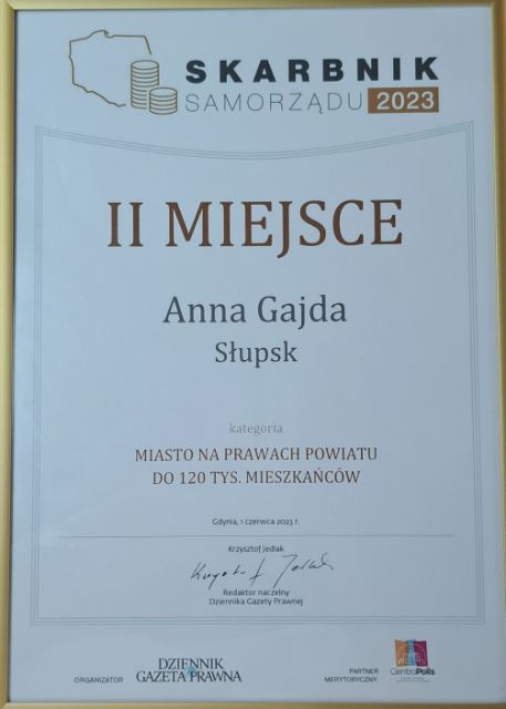 I taką osobą jest Pani Anna Gajda, Skarbnik Miasta Słupska, która w towarzystwie Pani Marty Makuch Wiceprezydentki Miasta Słupska odebrała dziś nagrodę - II miejsce dla Skarbnika Miasta Słupska w kategorii "miasta na prawach powiatu do 120 tys.mieszkańców".
