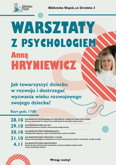 Zapraszamy do udziału w warsztatach dla rodziców dzieci szkolnych 1 kl. - 6 kl., które poprowadzi Anna Hryniewicz - psycholog, psychotraumatolog i pedagog. Temat: "Elastyczność psychologiczna, nastawienie na rozwój, czyli jak pomóc dzieciom samodzielnie rozwijać skrzydła”. Warsztaty odbędą się 31 października o godz. 17:00 w Miejskiej Bibliotece Publicznej im. Marii Dąbrowskiej w Słupsku. Wstęp wolny!