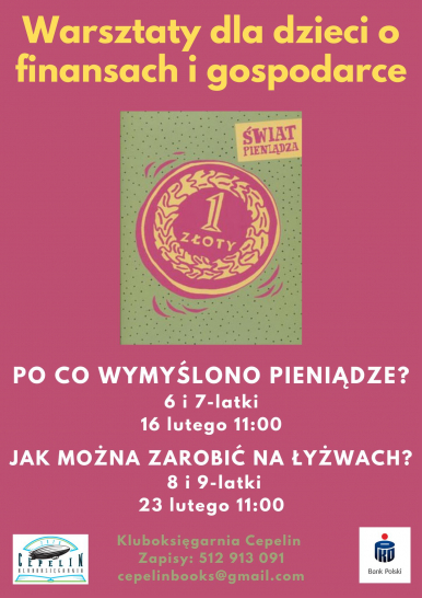 Wspólnie z PKO Bank Polski organizatorzy zapraszają dzieci w wieku 6-7 lat na warsztaty „Po co wymyślono pieniądze?” Podczas warsztatów dzieci dowiedzą się, czym dawniej płacono za towary, jak wyglądały pierwsze monety oraz sprawdzą, czy handel wymienny jest prosty. Dla każdego z uczestników mamy też pięknie wydaną książkę edukacyjną „Świat pieniądza”.