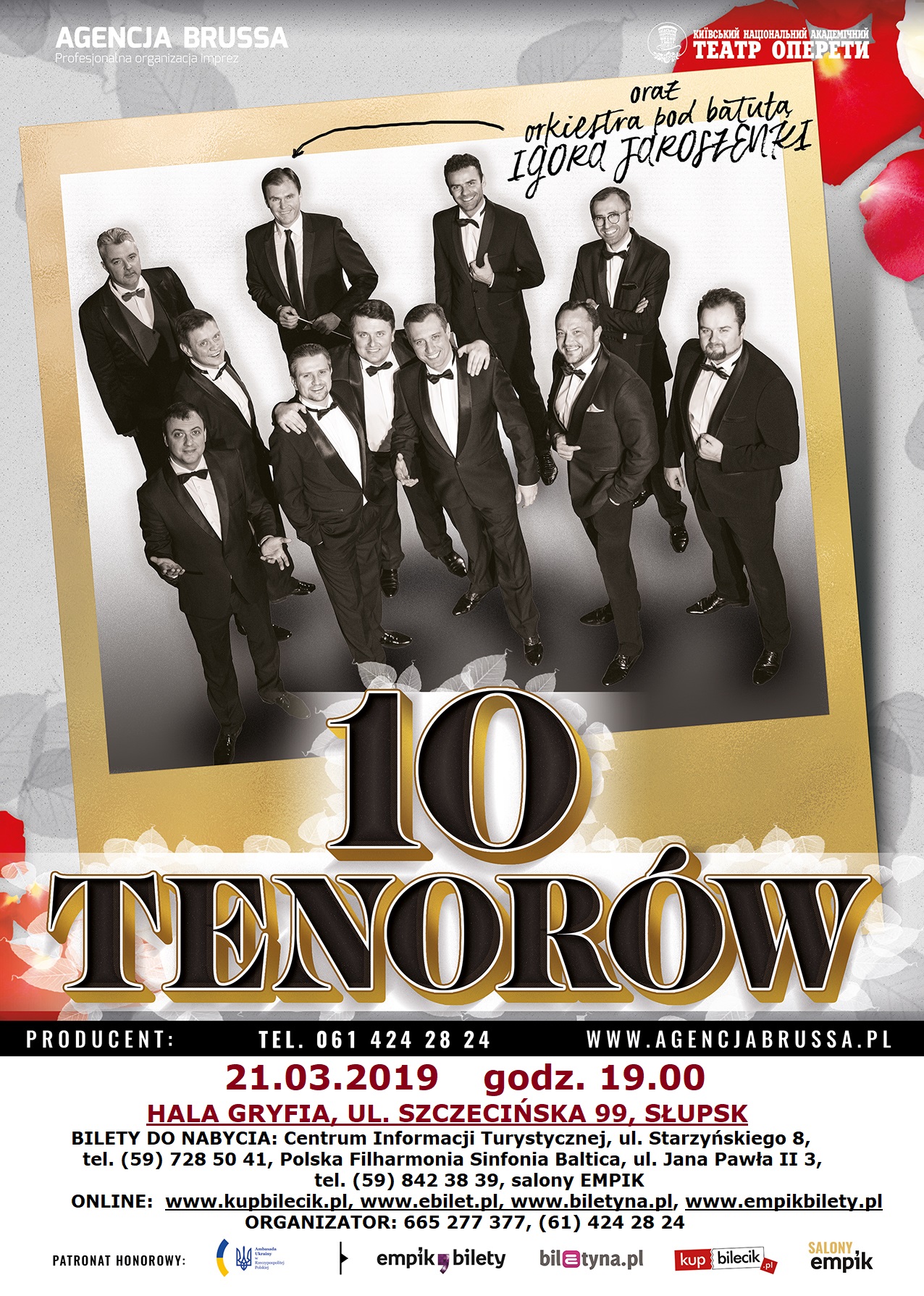W Słupsku 21 marca 2019 o 19.00 Trasa koncertowa 10 utalentowanych wokalistów gwarantuje pasję i uśmiech na twarzy. Najbardziej ekscytująca grupa wokalna 10 TENORÓW zaśpiewa dosłownie wszystko – od najlepszych piosenek romantyczny pop, ballad rockowych po utwory ludowe aż do arii operowej. Nic dziwnego – jest ich aż DZIESIĘCIU, więc i repertuar szeroki i możliwości znaczące. Ale to przecież nie jest cała prawda o 10 Tenorach z Polski i Ukrainy – ważnym elementem jest perfekcja z jaką wykonują muzykę oraz skala talentu, który pozwala na sięganie równocześnie do twórczości Johanna Straussa i Leonarda Cohena. Jakie są rezultaty tego spotkania? Oceńcie Państwo sami już w marcu!