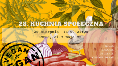 Zapraszamy na 28. edycję Kuchni Społecznej w Słupsku, czyli spotkanie przy wspólnym stole uginającym się od stuprocentowo roślinnych potrwa. Spotkanie odbędzie się 25 sierpnia w godz. 16:00 - 21:00 w budynku Emceku pod tarasem (al. 3 maja 22). Wydarzenia towarzyszące: Farma Uroczysko - warsztaty tworzenia ziołowych różdżek - naturalnych kadzideł, stanowisko Rękodzielni Słupskiego Ośrodka Kultury, szafing, czyli bezkosztowa wymiana ubrań oraz bazarek na rzecz zwierząt.