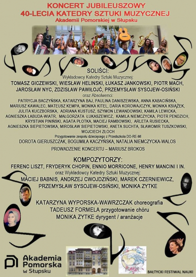 Katedra Sztuki Muzycznej (wcześniej Instytut Muzyki) od 40 lat prowadzi studia na kierunku Edukacji Artystycznej w Zakresie Sztuki Muzycznej. Przez ten czas pedagodzy tej jednostki wykształcili kilkuset absolwentów w różnych zawodach związanych z muzyką – nauczycieli, edukatorów, animatorów kultury, wykonawców, dyrygentów chórów, instruktorów muzycznych. Jubileuszowy koncert będzie zaprezentowaniem dorobku artystycznego wykładowców, absolwentów i studentów kierunku muzycznego Akademii Pomorskiej z Polską Filharmonią Sinfonia Baltica.