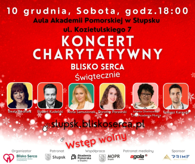 Ten jedyny w swoim rodzaju piękny artystyczny program świątecznym klimacie, wyreżyserowany i prowadzony przez aktorkę Annę Samusionek, uświetni obecność znakomitych wykonawców z różnych stron naszego kraju. Wystąpią: Beata Bednarz- wokalistka gospel, Dorothy Porawski- sopranistka, Robert Kudelski- aktor, dr Tomasz Karauda i 40-osobowy Chór ZNP Academia Musica ze Słupska. Podczas Koncertu zbierane będą pieniądze na pomoc dwóm braciom - 4 letniemu Patrykowi i 10 miesięcznemu Jasiowi Bosek ze Słupska. Uwaga! Wstęp na koncert jest BEZPŁATNY. Ilość miejsc ograniczona. Bilety do odbioru w biurze SCOPiES ul. Niedziałkowskiego 6 w Słupsku.