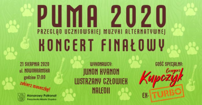 21 sierpnia 2020 o godzinie 17:00 przy ul. Nowobramskiej zapraszamy na plenerowy koncert finałowy siódmego Przeglądu Uczniowskiej Muzyki Alternatywnej – PUMA 2020. Na scenie laureaci konkursu zaprezentują swoją muzykę w przestrzeni miejskiej, a koncert uświetni swoją obecnością i występem Grzegorz Kupczyk, były wokalista zespołu Turbo, jeden z najznamienitszych głosów rockowych w Polsce.