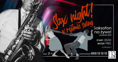 Sax Night w rytmie swing to wtkowy wieczór z saksofonem na żywo! Daj porwać się muzyce lat 20-40 ubiegłego wieku i poswinguj na naszym parkiecie w klimacie retro potańcówek. Przyjdź z przyjaciółmi, partnerem lub solo!
