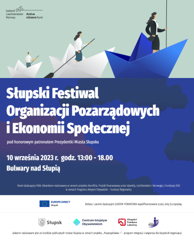 Prezydentka Miasta Słupska oraz Centrum Inicjatyw Obywatelskich w Słupsku zapraszają na Słupski Festiwal Organizacji Pozarządowych i Ekonomii Społecznej pod patronatem Prezydentki Miasta Słupska - 10 września 2023 r. w godz. 13:00-18:00 na słupskich bulwarach nad Słupią. W programie mnóstwo atrakcji, m.in. animacje, gry i zabawy, pokazy ratownictwa medycznego, warsztaty taneczne, pokazy sztuk walki i wiele wiele innych. Podczas festiwalu będą mieli Państwo możliwość zapoznania się z profilem i działalnością prezentujących się organizacji pozarządowych.