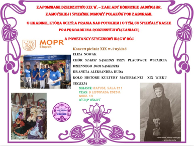 Dr Aneta A. Duda wraz z Kołem Historii Kultury Materialnej XIX w. „Secesja” oraz Eliza Nowak wraz z chórem Starsi Sąsiedzi Placówki Wsparcia Dziennego Dom Sąsiedzki w Słupsku zapraszają na połączony z wykładem koncert "Zapomniane dziedzictwo XIX wieku - zakłady kórnickie Jadwigi hr. Zamoyjskiej i Śpiewnik Domowy Polaków pod zaborami". Patriotyczne wydarzenie odbędzie się w czwartek, 9 listopada, o godz. 13 w sali 211 słupskiego ratusza. Wstęp wolny.