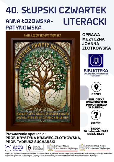 Zapraszamy do Biblioteki Uniwersytetu na kolejne spotkanie w ramach cyklu Słupskie Czwartki Literackie. Gościem spotkania będzie dr Anna Łozowska-Patynowska, autorka książki "Wszystkie chwyty dozwolone? Warianty gry o władzę w Kronice Polskiej Mistrza Wincentego zwanego Kadłubkiem".