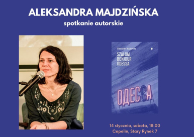 Organizatorzy zapraszają na spotkanie z Aleksandrą Majdzińską, pisarką, nauczycielką polonijną, scenarzystką, tłumaczką, autorką zbioru opowiadań "Morkut i inne opowiadania" oraz reportażu literackiego "Szalom bonjur Odessa". Pisarka pochodzi z małej miejscowości Stara Dąbrowa koło Słupska. Za scenariusz do filmu „Mleczny brat” otrzymała w 2014 r. nagrodę za najlepszy scenariusz podczas Międzynarodowego Festiwalu Filmowego „Złota Morela” w Armenii, a także została nominowana do Nagrody Polskiego Kina Niezależnego im. Jana Machulskiego.