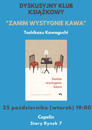 Spotkanie odbędzie się przy dyskusji wokół książki, która stała się światowym hitem ostatnich miesięcy. W tej niewielkiej pozycji Toshikazu Kawaguchi zabiera nas do małej kawiarni w Tokio, która pozwala swoim gościom na podróż w czasie. Pod warunkiem, że wrócą, zanim wystygnie kawa… Spotykamy cztery osoby, z których każda ma nadzieję skorzystać z tej oferty. Ktoś chce się skonfrontować z dawną miłością, ktoś powrócić do czasów sprzed utraty pamięci, zobaczyć się z siostrą, spotkać córkę, której nigdy nie było okazji poznać.