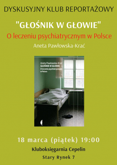 Wszystkich miłośników reportaży organizatorzy zapraszają na pierwsze spotkanie Dyskusyjnego Klubu Reportażowego w Cepelinie. Na pierwsze spotkanie wybrano temat niełatwy, ale bardzo ważny, który świetnie obrazuje reportaż Anety Pawłowskiej-Krać "Głośnik w głowie. O leczeniu psychiatrycznym w Polsce".