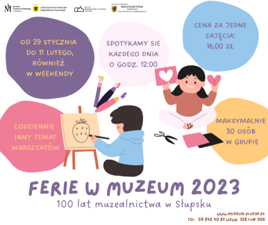 W czasie ferii zimowych, od 29 stycznia do 11 lutego 2024 roku, Muzeum Pomorza Środkowego w Słupsku zaprasza codziennie o godz. 12:00 na zajęcia edukacyjne. Wcześniejsze zapisy nie są wymagane, wystarczy przyjść na wybrane warsztaty kilka minut przed godz. 12:00 i uiścić opłatę w kasie Zamku Książąt Pomorskich lub Białego Spichlerza (w zależności od wybranych zajęć). Każdy dzień to inny temat.
