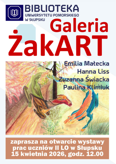 Biblioteka Uniwersytetu Pomorskiego w Słupsku zaprasza 15 kwietnia o godz. 12.00 do Galerii ŻakART na otwarcie wystawy prac uczniów II LO w Słupsku oraz odwiedzanie wystawy w innych terminach w godzinach otwarcia Biblioteki (pon.-pt. 8.00-15.00, pt. 11.00-18.00