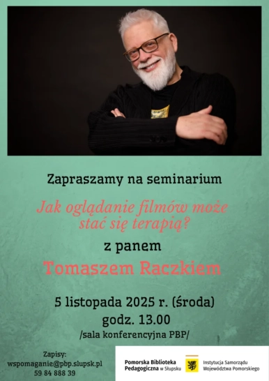 5 listopada o godz. 13.00 w sali konferencyjnej Pomorskiej Biblioteki Pedagogicznej w Słupsku odbędzie się spotkanie ze znanym krytykiem filmowym Tomaszem Raczkiem dla nauczycieli bibliotekarzy i wszystkich zainteresowanych. Seminarium będzie dotyczyło tego, jak oglądanie filmów może stać się terapią.