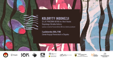 Dyrektorka Słupskiego Ośrodka Kultury Jolanta Krawczykiewicz oraz Dyrektorka Muzeum Pomorza Środkowego w Słupsku Marzenna Mazur mają zaszczyt zaprosić na wystawę czasową "Koloryty Indonezji. 35 lat Pracowni Batiku im. Marii Hasiec". Wystawa ze zbiorów Pracowni Batiku Słupskiego Ośrodka Kultury oraz ze zbiorów prywatnych będzie dostępna od 2 października do 3 listopada w Zamku Książąt Pomorskich w Słupsku.