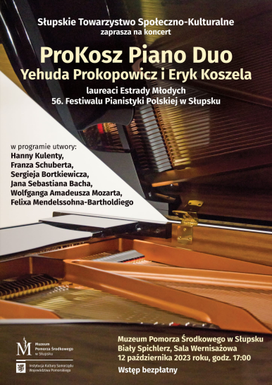 Słupskie Towarzystwo Społeczno-Kulturalne zaprasza na koncert Yehudy Prokopowicza i Eryka Koszeli, występującego jako ProKosz Piano Duo. Młodzi pianiści to laureaci Estrady Młodych 56. Festiwalu Pianistyki Polskiej w Słupsku. Wstęp na koncert 12 października o godz. 17:00 w Białym Spichlerzu bezpłatny.