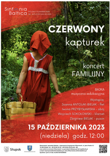 Pierwszy w tym sezonie koncert familijny jest propozycją skierowaną do najmłodszych słuchaczy. Muzyczno-edukacyjną bajkę „Czerwony kapturek” zaprezentuje dzieciom czworo pozytywnie zakręconych muzyków: Joanna Antolak-Bielak, Iwona Przybysławska, Wojciech Sokołowski, Zbigniew Bielak. Bohaterami tej historii są instrumenty dęte drewniane i blaszane: flet, obój, klarnet oraz puzon. Muzycy zagrają na nich eksponując nie tylko ich barwę, lecz również omawiając budowę i charakterystyczne dla nich cechy.