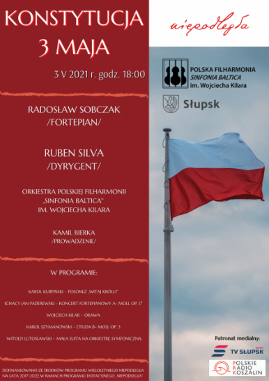 Już 3 maja o godz. 18:00 odbędzie koncert upamiętniający podpisanie pierwszej polskiej Konstytucji. W repertuarze: Karol Kurpiński – Polonez „Witaj Królu!"; Ignacy Jan Paderewski – Koncert Fortepianowy a- moll op. 17; Wojciech Kilar – Orawa; Karol Szymanowski – Etiuda b-moll op. 3; Witold Lutosławski – Mała Suita na orkiestrę symfoniczną. Wydarzenie uświetni występ dzieci z Przedszkola Miejskiego nr 15 oraz z Państwowej Szkoły Muzycznej I i II stopnia im. Ignacego Jana Paderewskiego, które zaśpiewają Hymn Polski przy akompaniamencie Orkiestry, natomiast dzieci z Przedszkola Miejskiego nr 19 oraz Przedszkola Miejskiego nr 12 w Słupsku przygotują Kokardy Narodowe. Wydarzenie dostępne będzie przez streaming, link podany zostanie na stronie Facebook Polskiej Filharmonii Sinfonia Baltica im. Wojciecha Kilara.