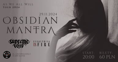 29 listopada 2024 wielkopolska grupa Obsidian Mantra odwiedzi Słupsk- Motor Rock Pub, w ramach trasy promującej nowe wydawnictwo zespołu pt. “As We All Will”. Organizatorzy: Obsidian Mantra, Motor Rock Pub, Supreme Void, Everything Is Fire ul. Grunwaldzka 1, 76-200 Słupsk, Poland 29.11 godz.18:00 |