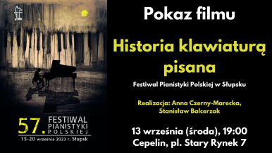 Zanim rozpocznie się 57. Festiwal Pianistyki Polskiej w Słupsku, zapraszamy Państwa na filmową podróż po historii tego wydarzenia. W środę, 13 września, o godz. 19:00, w kluboksięgarni Cepelin zaprezentujemy film dokumentalny pt. "Historia klawiaturą pisana" zrealizowany przez Annę Czerny-Marecką oraz Stanisława Balcerzaka. Opowiada on historię jednego z najważniejszych wydarzeń kulturalnych na mapie Słupska, a także ludzi stojących za jego organizacją i rozwojem.