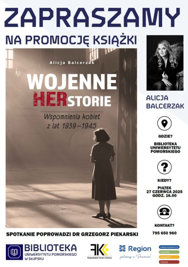 Biblioteka Uniwersytetu Pomorskiego w Słupsku wraz z Wydawnictwem Region serdecznie zaprasza na promocję książki Alicji Balcerzak pt. "WOJENNE HERSTORIE. Wspomnienia kobiet z lat 1939-1945". Spotkanie poprowadzi dr Grzegorz Piekarski, dyrektor Instytut Pedagogiki i Psychologii Uniwersytetu Pomorskiego w Słupsku. Wszystkich chętnych do wzięcia udziału w tym wydarzeniu serdecznie zapraszamy w piątek, 27 czerwca 2025 r. o godz. 16.00