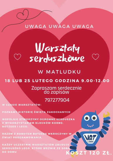 Luty jest miesiącem miłości. W słowie miłość mieszczą się ciepłe serdeczne uczucia, które kierowane mogą być do rodziców, innych bliskich z rodziny, przyjaciół, zwierząt, natury.... Ciepło, serdeczność, sympatię, bliskość... możemy rozsiewać dosłownie wszędzie. I w taki właśnie sposób porozmawiamy o tych uczuciach w części wprowadzającej na warsztatach. A później.... kreatywne szaleństwo serduszkowe. Zapisy pod numerem: 797 277 904. Koszt warsztatów 120zł.