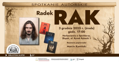 Zapraszamy 3 grudnia 2025 r. (środa), godz. 17:00 do Herbaciarni w Spichlerzu Richtera ul. Rynek Rybacki 1 na spotkanie autorskie z Radkiem Rakiem - polskim pisarzem, którego twórczość zadziwia i inspiruje.
