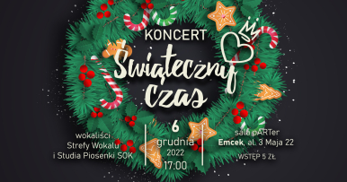 Organizatorzy zapraszają na Koncert ,,Świąteczny Czas" w wykonaniu Wokalistów ze Strefy Wokalu i Studia Piosenki SOK. Poczujmy magię świąt! Mikołajkowy wieczór spędźmy na wspólnym kolędowaniu i śpiewaniu piosenek zimowych. Bilet 5zł.
