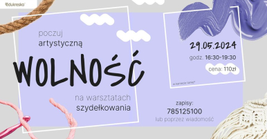 Organizatorzy zapraszają Was na warsztaty szydełkowania chusty. Spędźcie czas w miłym towarzystwie i naucz się nowego hobby. W cenie warsztatów wchodzi: włóczka, szydełko (które wróci z Tobą do domu), schemat, herbatka, kawa, słodki poczęstunek, dołączenie do specjalnej grupy na Facebooku. Warsztaty są wprowadzeniem do szydełkowania trójkątnej chusty. By w pełni ukończyć całą chustę należy uczestniczyć co najmniej w dwóch spotkaniach (dostępna jest wtedy zniżka). Jeśli jesteś również zainteresowana/ny warsztatami makramy i malowania obrazów na płótnie to dołącz do grupy na messengerze Do zobaczenia w szkole Edukreska na ul. Józefa Poniatowskiego 42.