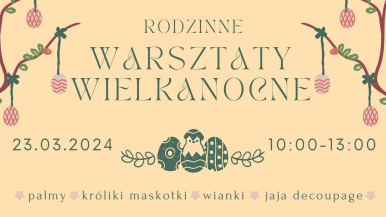 Rodzinne warsztaty świąteczne, w pracowni ceramicznej SOK "Rękodzielnia". Palmy, wianki, wypychane króliki/kurki i jajka decoupage! Organizatorzy zapraszają małych i dużych, całe rodziny, sąsiadów, przyjaciół i bliskich, życząc jednocześnie fantastycznej zabawy i Wesołych Świąt!