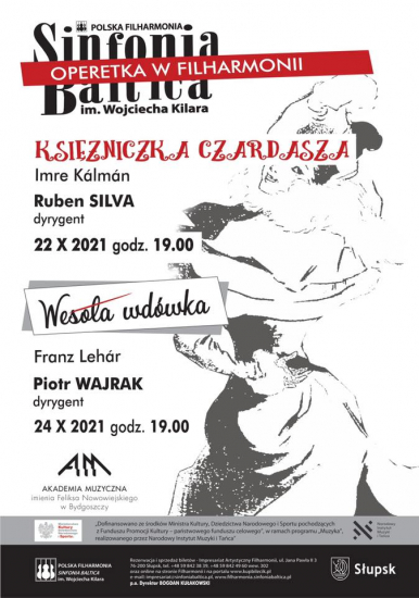 Zapraszamy na sceniczną prezentację operetki Wesoła wdówka z udziałem studentów i absolwentów wydziału wokalno-aktorskiego Akademii Muzycznej im. Feliksa Nowowiejskiego w Bydgoszczy. Młodym artystom towarzyszyć będzie Orkiestra Polskiej Filharmonii Sinfonia Baltica im. Wojciecha Kilara pod batutą Piotra Wajraka - dyrygenta bydgoskiej Opery Nova. Kompozytorem tej operetki jest Franz Lehár, zaś libretto napisali Victor Léon i Leo Stein. Fabuła dotyczy wdowy po bankierze Pontevedry - Hanny Glawari, która jako jedyna spadkobierczyni ogromnego spadku staje się obiektem zainteresowania wielu kawalerów. Sytuację komplikuje fakt, iż tytułowa "wdówka" skłania się ku wyjazdowi do Paryża i istnieje obawa, że może tam wyjść za mąż. Książęcy poseł ma nie dopuścić do takiego małżeństwa i wyswatać Hannę za rodaka, aby jej miliony pozostały w księstwie. Idealnym kandydatem zdaje się być hrabia Daniło Daniłowicz - okazuje się jednak, iż Hanna i Daniło mają przeszłość, która może zniweczyć cały plan.