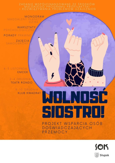 „Wolność siostro!” to najnowszy projekt realizowany przez Słupski Ośrodek Kultury. Skierowany jest do osób doświadczających przemocy: fizycznej, psychicznej, ekonomicznej. Przede wszystkim do kobiet, bo one są najczęściej ofiarami. Ale również do mężczyzn, którym nieobce są takie doświadczenia. Na projekt złoży się prezentacja autorskiego monodramu Magdaleny Płanety „Dzika” oraz seria warsztatów psychologicznych, prawniczych i samoobrony. Po spektaklu odbędzie się 45 minutowy panel dyskusyjny, w ramach którego każdy widz będzie mógł podzielić się swoimi wrażeniami, doświadczeniami i przemyśleniami w związku z tematem.