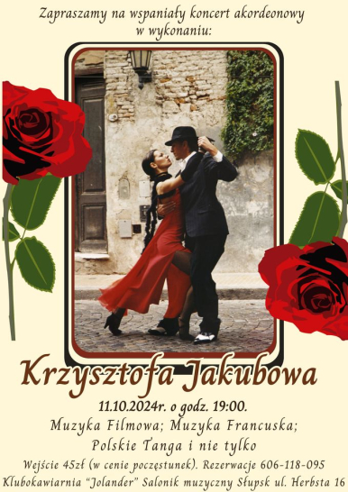 Wykonane zostaną utwory międzynarodowej muzyki filmowej, piosenki francuskiej, polskie tanga i nie tylko.