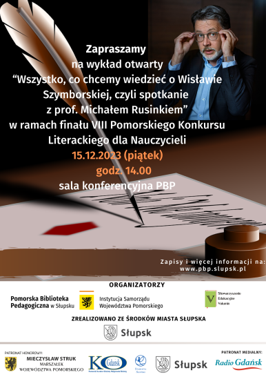 Na zakończenie roku 2023, Roku Wisławy Szymborskiej, w ramach finału VIII Pomorskiego Konkursu Literackiego dla Nauczycieli, odbędzie się wykład literaturoznawcy dr hab. prof. UJ Michała Rusinka, autora książek dla dzieci, młodzieży i dorosłych, byłego sekretarza poetki, prezesa Fundacji Wisławy Szymborskiej. Profesor przybliży uczestnikom spotkania życie i twórczość noblistki, podzieli się z publicznością osobistymi doświadczeniami z wielu lat pełnienia funkcji sekretarza poetki. Opowie jak powstawały wiersze, limeryki, lepieje i inne, ciekawe formy twórczości Wisławy Szymborskiej.