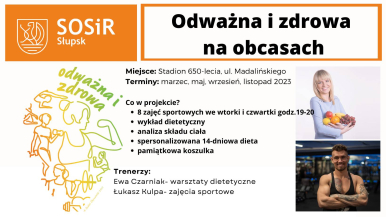 Celem projektu jest zadbanie o zdrowie i sprawność Mieszkanek miasta Słupska poprzez zachęcenie do udziału w ogólnorozwojowych zajęciach sportowych oraz edukacja żywieniowa, która uporządkuje i pogłębi wiedzę uczestniczek na temat zdrowego odżywiania. Żeby się zapisać trzeba posiadać Kartę Mieszkańca Słupska.